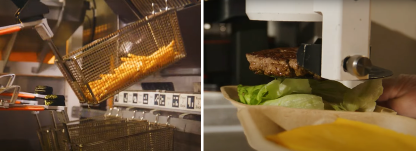 · 그릴 로봇이 실시간으로 쇠고기를 갈아 신선한 패티 조리 후, 빵 위에 올린 후 사람이 직접 포장해 마무리