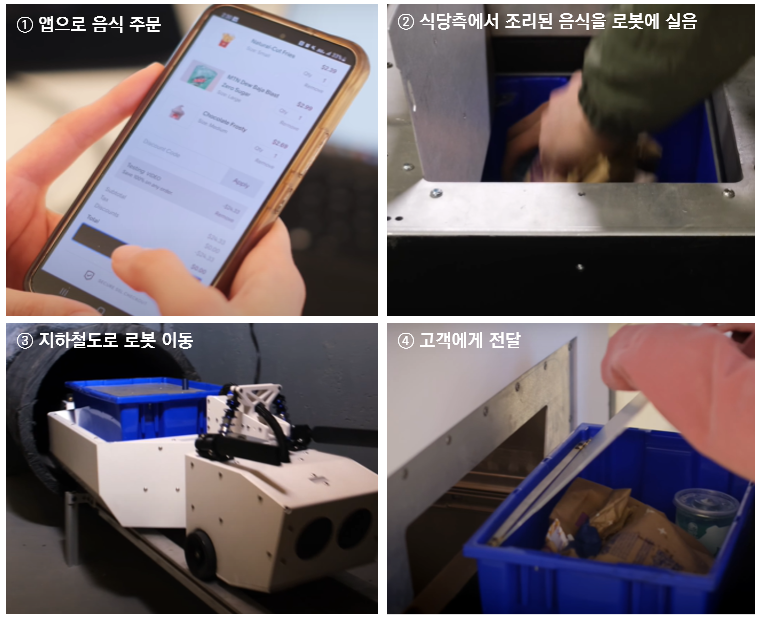 · 인근 쇼핑센터와 연결해 앱으로 음식 주문 시 10분 이내 로봇이 지하철도를 통해 고객에게 배달