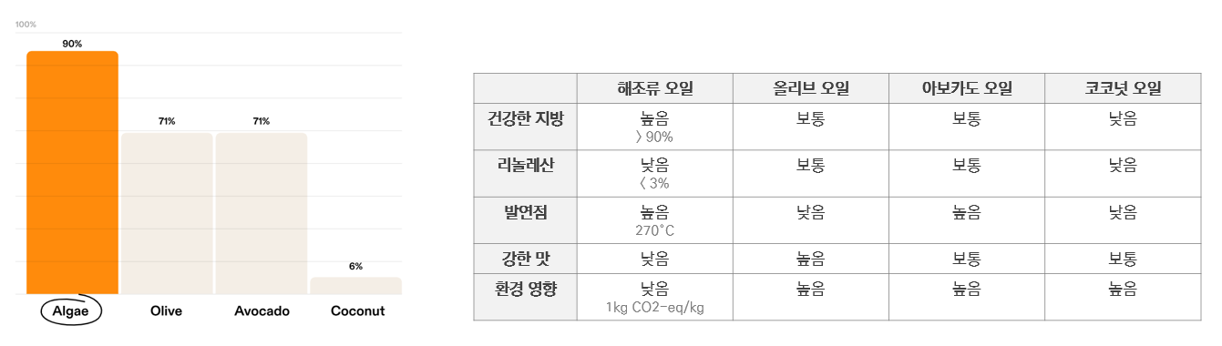 ㅇ 조류 오일은 올리브오일·아보카도오일·카놀라유 등의 탄소배출량 1/2 수준으로 환경 친화적이며, 올리브오일 및 아보카도오일은 오메가-9 약 70% 함유하는 반면 조류 오일은 93% 함유하여 건강상 이점 존재
