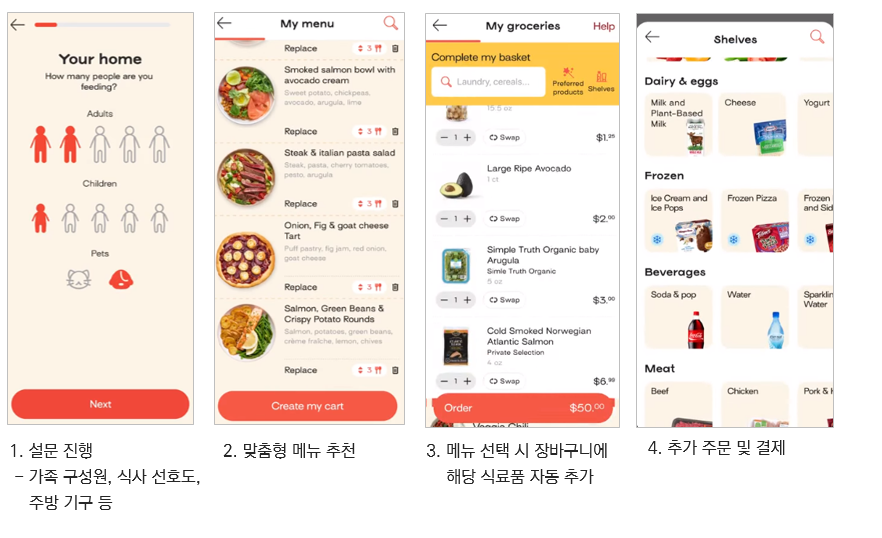 ㅇ 어플 내 간단 설문 진행 후 AI 기반 맞춤형 메뉴 추천 및 해당 메뉴 조리 위해 필요한 식료품 바로 구매 가능